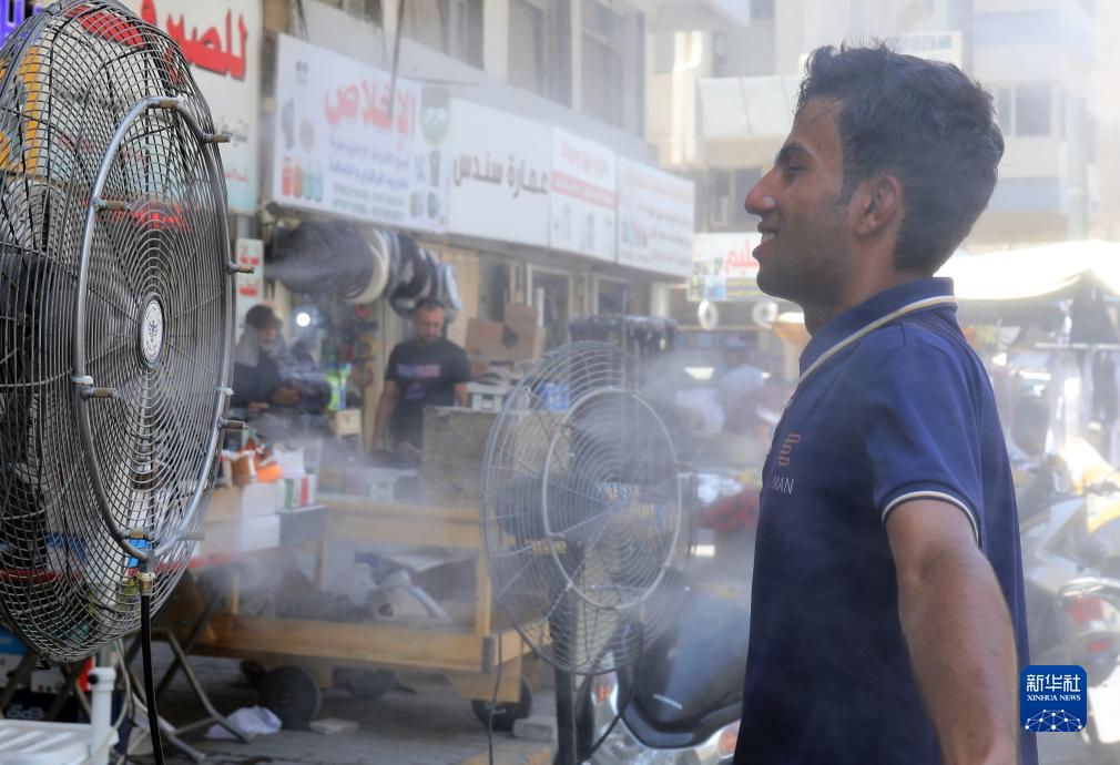 7月18日,在伊拉克巴格达,一名男子在街头吹电扇降温。