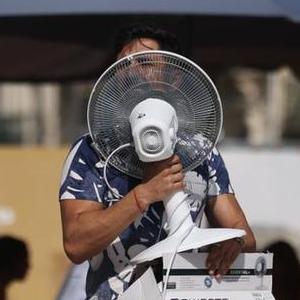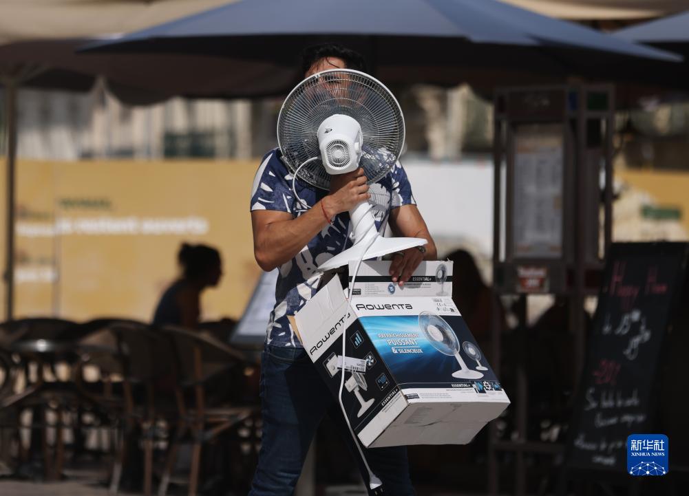 7月19日,一名男子搬着电风扇走在法国南部城市蒙彼利埃街头。