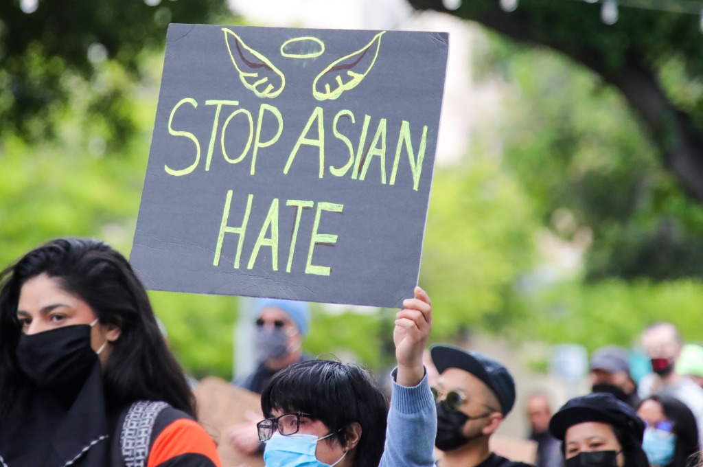 2021年4月25日,人们在美国加利福尼亚州旧金山湾区城市圣何塞集会抗议针对亚裔的歧视行为和仇恨犯罪。新华社发(董旭东摄)