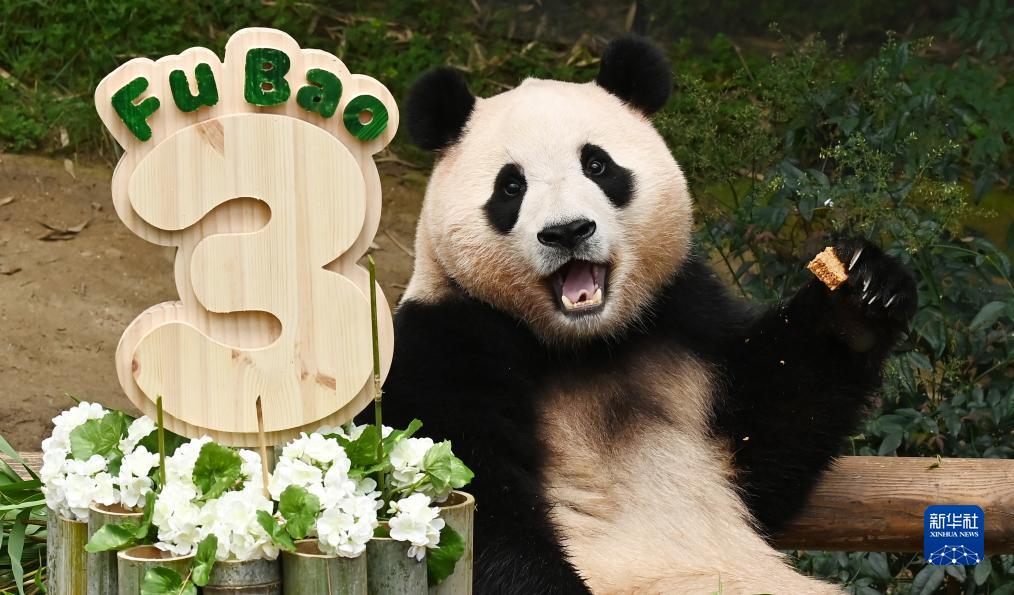 当日,在韩国出生的大熊猫“福宝”迎来3岁生日,园区制作了由竹子和胡萝卜组成的“蛋糕”为其庆生。