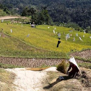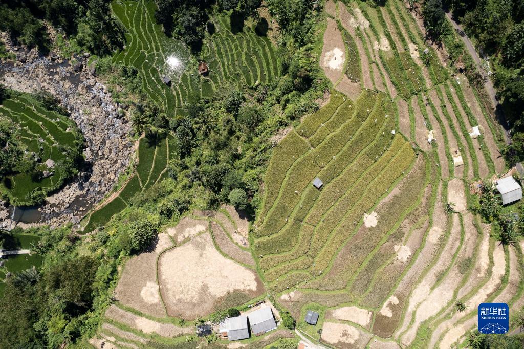 这是7月20日在印度尼西亚西爪哇省茂物地区的乡间拍摄的稻田(无人机照片)。当前正值稻米收获季。