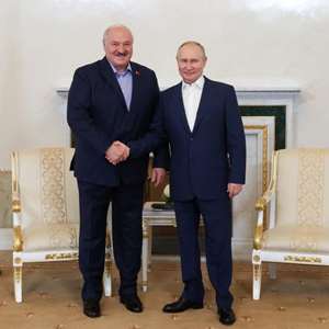 7月23日,在俄罗斯圣彼得堡,俄罗斯总统普京(右)与白俄罗斯总统卢卡申科握手。