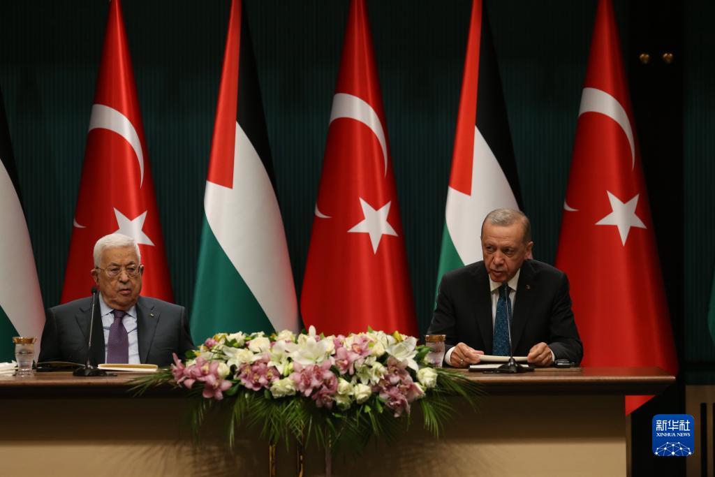 7月25日,土耳其总统埃尔多安(右)与巴勒斯坦国总统阿巴斯(左)在安卡拉会见后举行新闻发布会。