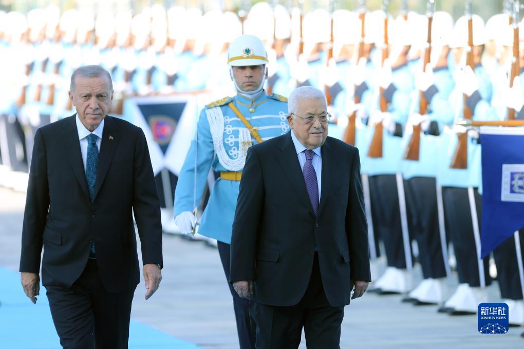 7月25日,土耳其总统埃尔多安(左)在安卡拉欢迎到访的巴勒斯坦国总统阿巴斯(右)。