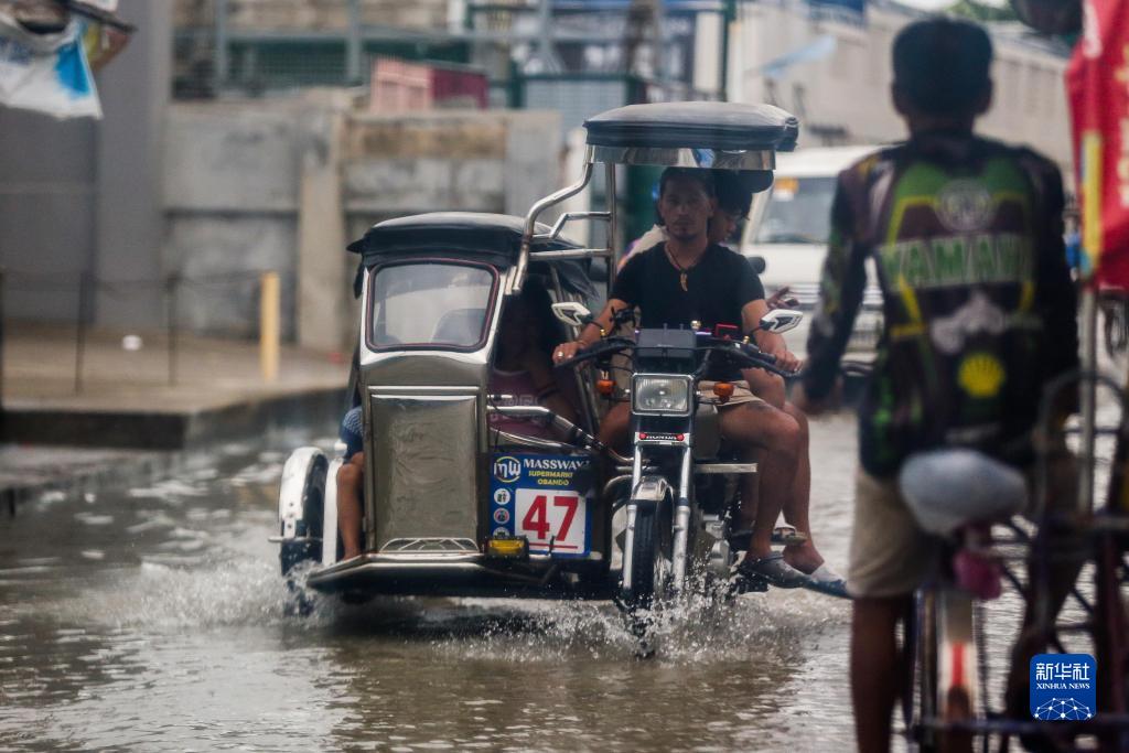 7月26日,人们在菲律宾马拉邦一处积水的街道涉水而行。