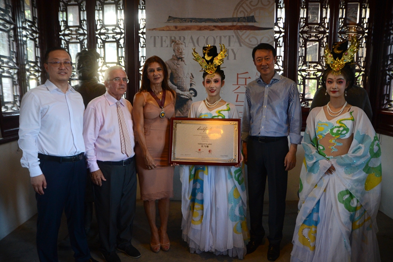 当天,静园内还举行了西安市向桑塔露琪亚市赠送兵马俑复刻品仪式。此次赠送给桑塔露琪亚市的兵马俑复刻品,按照俑坑中兵俑1:1仿造烧制,今后将长期在静园展出。
