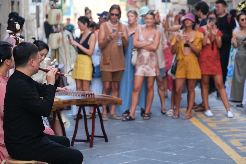 7月23日,马耳他瓦莱塔,人们在长安花灯节上欣赏中国艺术家演奏的传统音乐。(乔纳森•博格 摄)