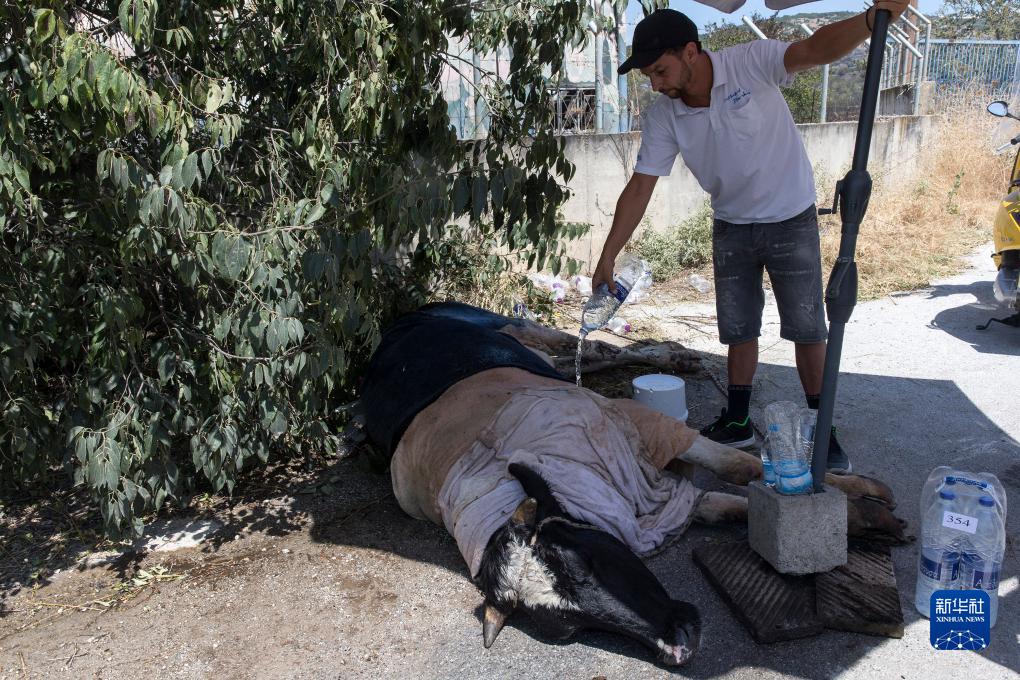 7月27日,在希腊沃洛斯郊外,农民照顾受伤的牲畜。新华社发(马里奥斯·罗洛斯摄)