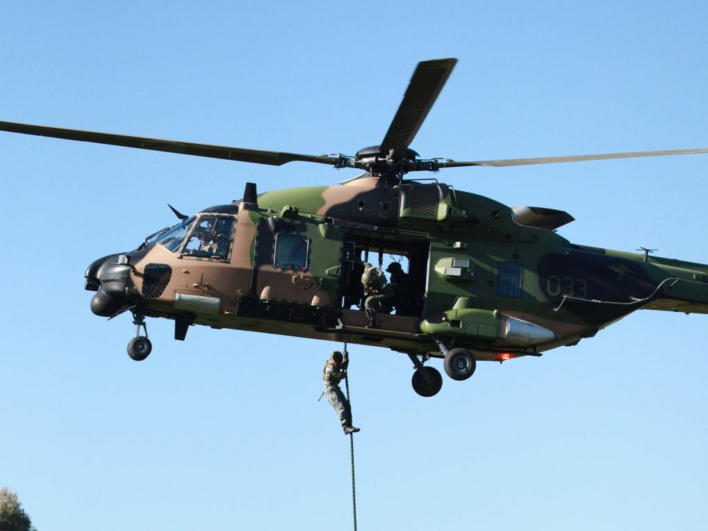 这是2019年8月24日在澳大利亚堪培拉的澳大利亚国防学院拍摄的直升机绳降展示。新华社发(储晨摄)