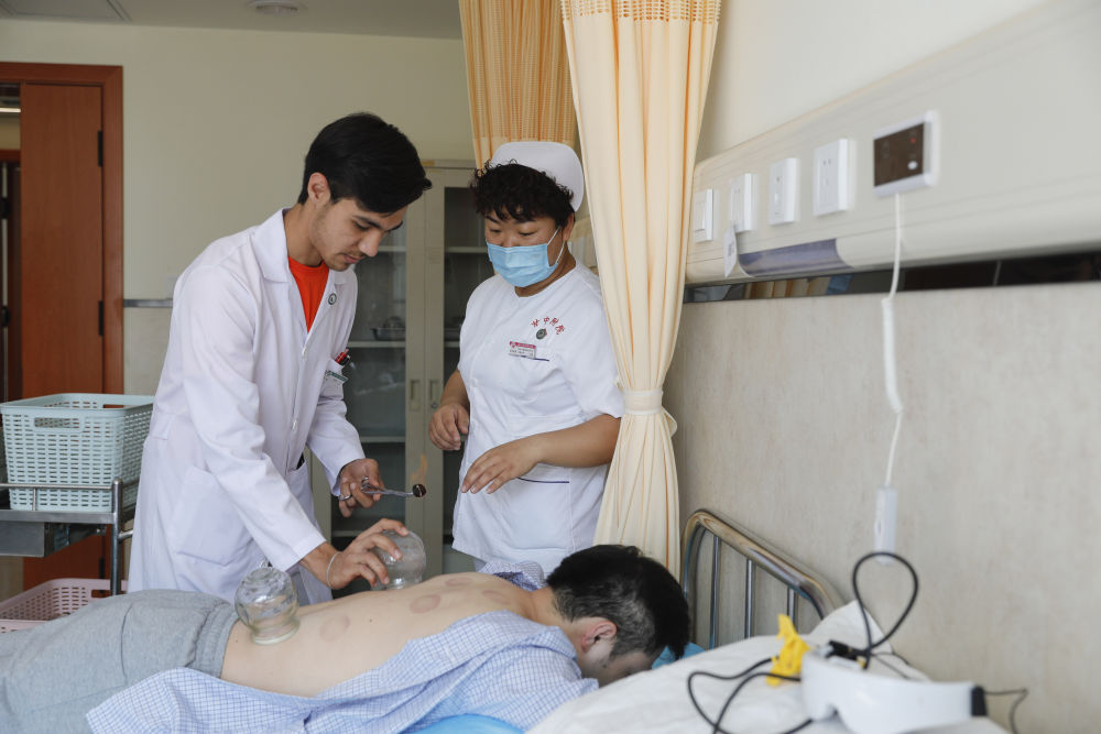 这是7月28日拍摄的土库曼斯坦留学生迪达(左)在甘肃中医药大学附属医院为患者拔罐。新华社记者 方欣 摄