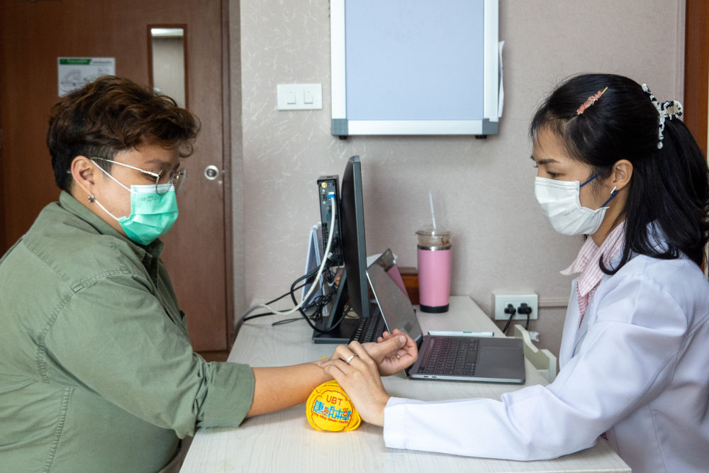 这是7月21日拍摄的岐黄泰国中医药中心一名医生正在把脉。新华社记者 林昊 摄