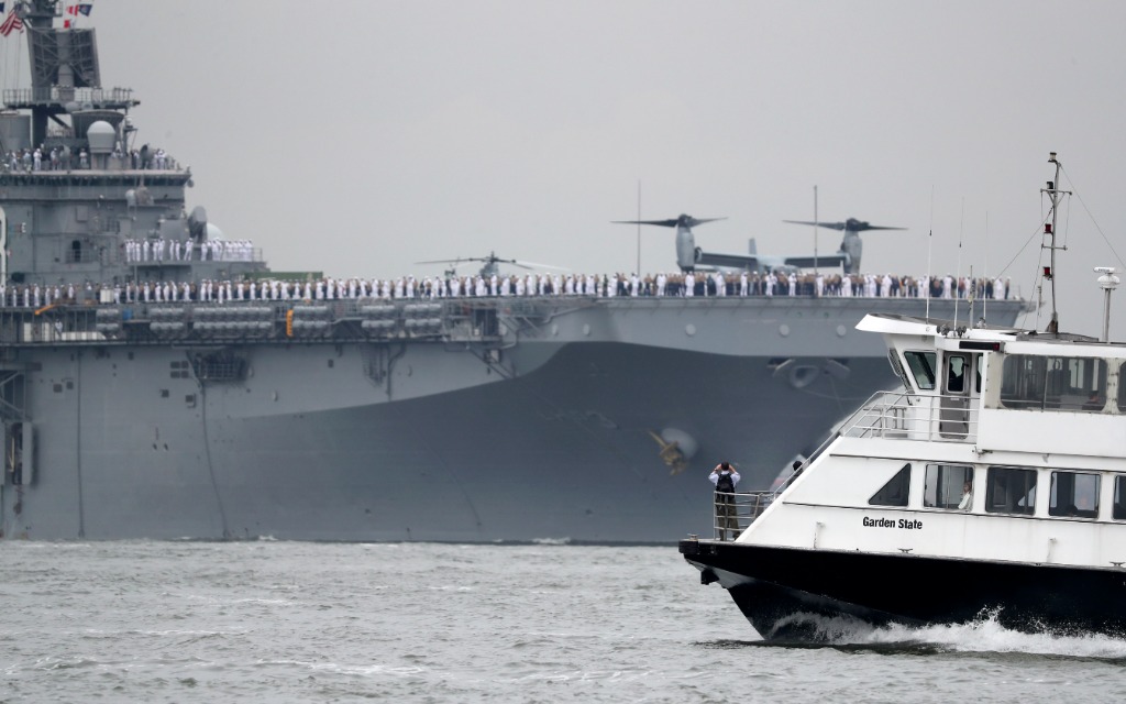 2017年5月24日,在美国纽约,美国海军“基萨奇”号两栖攻击舰参加纽约舰队周舰船巡游活动。新华社记者王迎摄