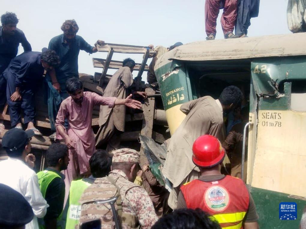 8月6日,人们在巴基斯坦南部信德省桑克尔地区的列车脱轨事故现场搜救。
