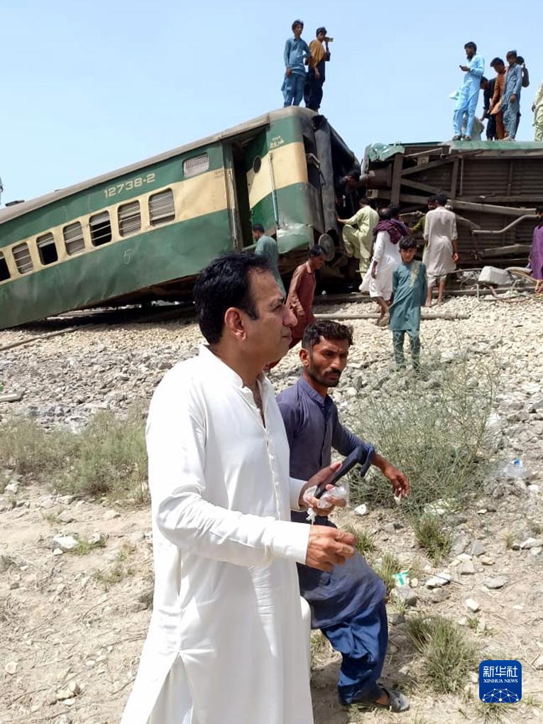 8月6日,在巴基斯坦南部信德省桑克尔地区,人们从脱轨的列车旁走过。