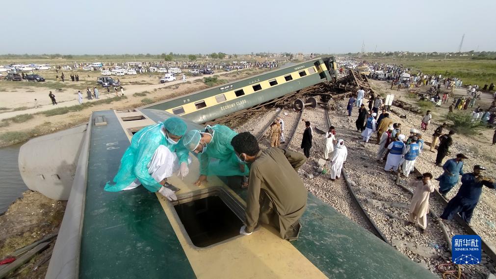 8月6日,救援人员在巴基斯坦南部信德省桑克尔地区的列车脱轨事故现场工作。