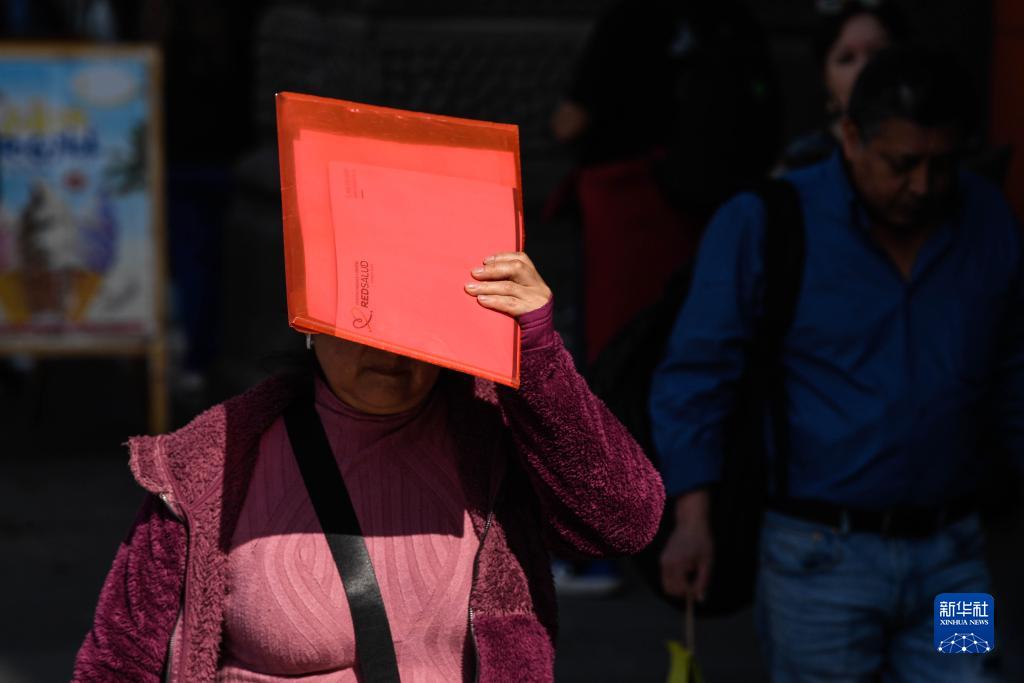 8月4日,行人在智利首都圣地亚哥街头用文件夹遮阳。