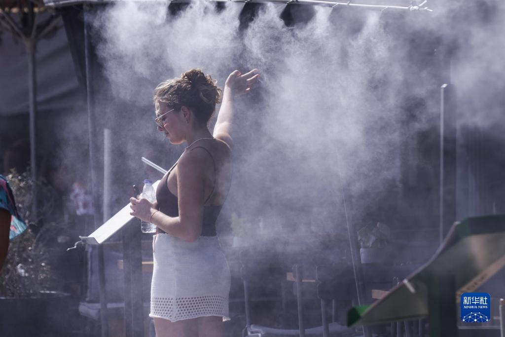 7月23日,在希腊雅典一家咖啡馆外,一名女子在喷雾风扇下乘凉。