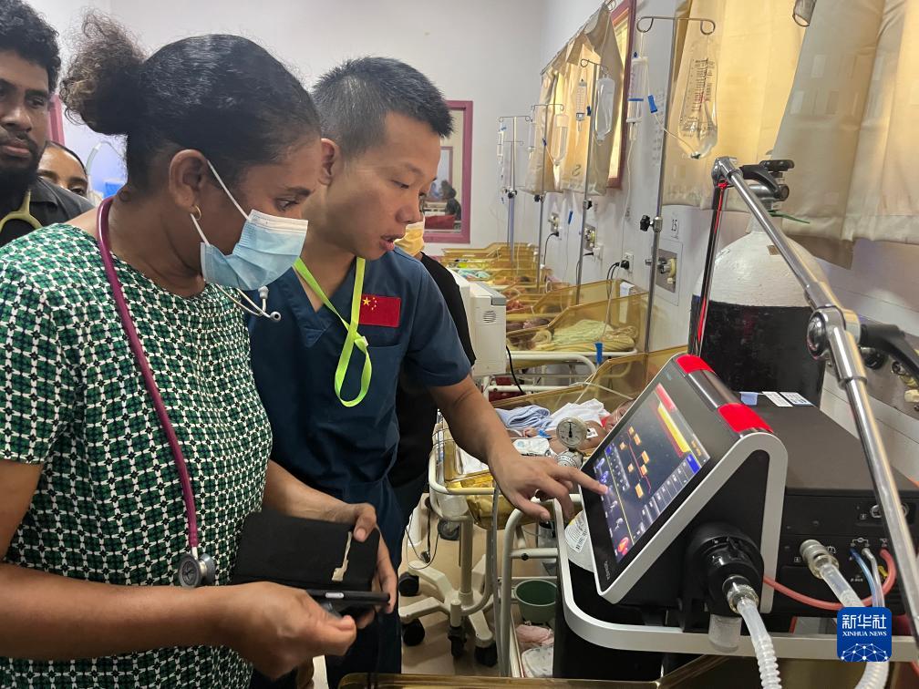5月1日,在巴布亚新几内亚莫尔兹比港总医院新生儿科,第12批援巴新中国医疗队副队长刘振球为当地医护人员开展呼吸机操作培训。