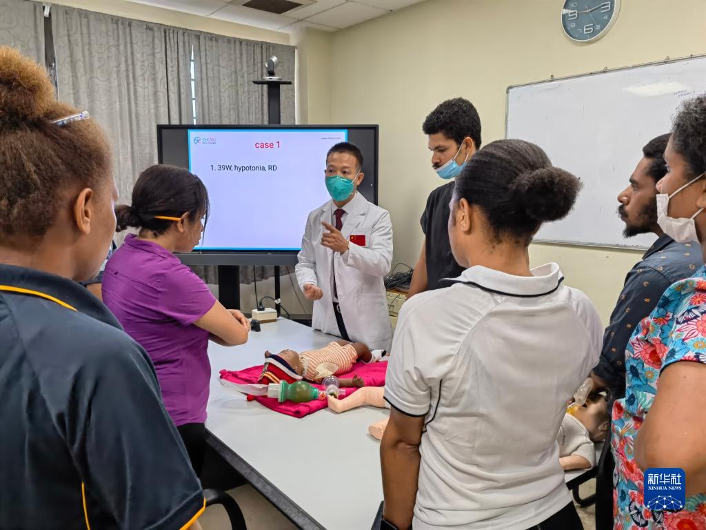 2022年12月16日,在巴布亚新几内亚新爱尔兰省,第12批援巴新中国医疗队副队长刘振球为当地医护人员进行新生儿复苏操作培训。