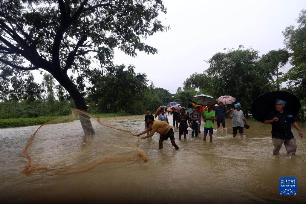 8月8日,在孟加拉国吉大港,人们在积水的道路上捕鱼。