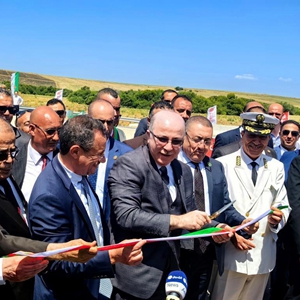 8月12日,在阿尔及利亚塔夫省,阿尔及利亚总理阿卜杜拉赫曼(前左三)出席阿尔及利亚东西高速公路东标段84公里项目通车仪式并剪彩。新华社发(中信建设供图)