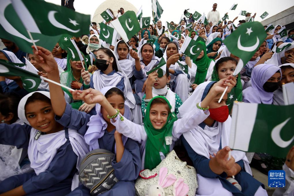 8月14日,在巴基斯坦卡拉奇,当地学生参加巴基斯坦独立76周年庆祝活动。
