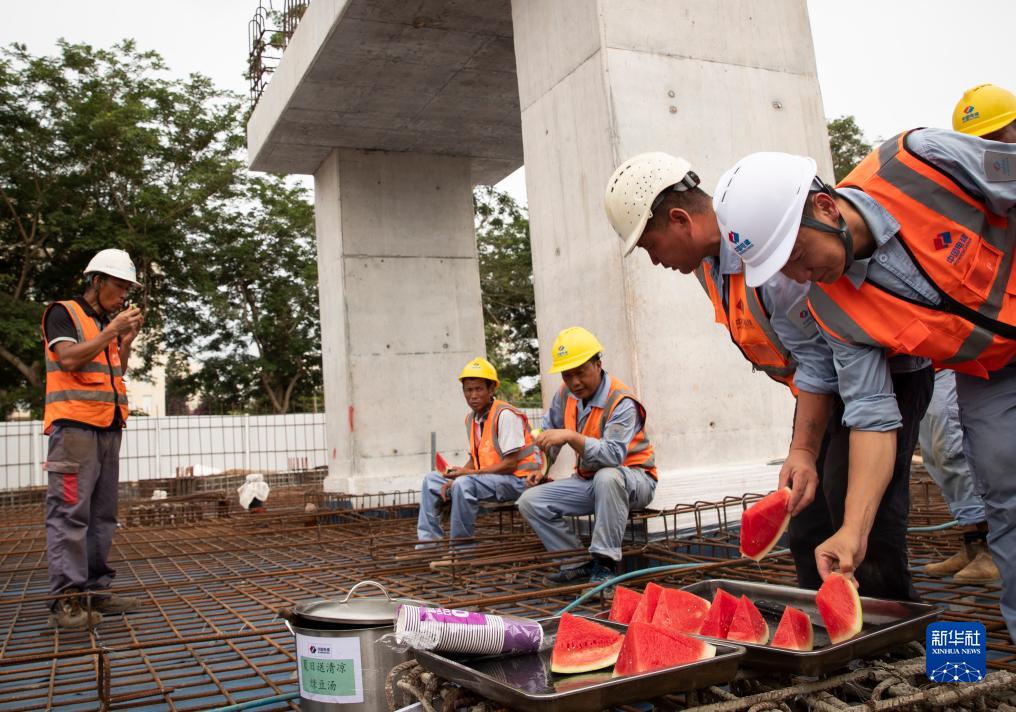 8月14日,建设人员在以色列特拉维夫轻轨绿线G3-4标段工程施工现场作业的间隙吃西瓜。
