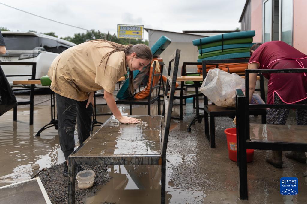 8月15日,在俄罗斯乌苏里斯克市,一家餐厅的工作人员清洁被洪水浸泡过的家具。