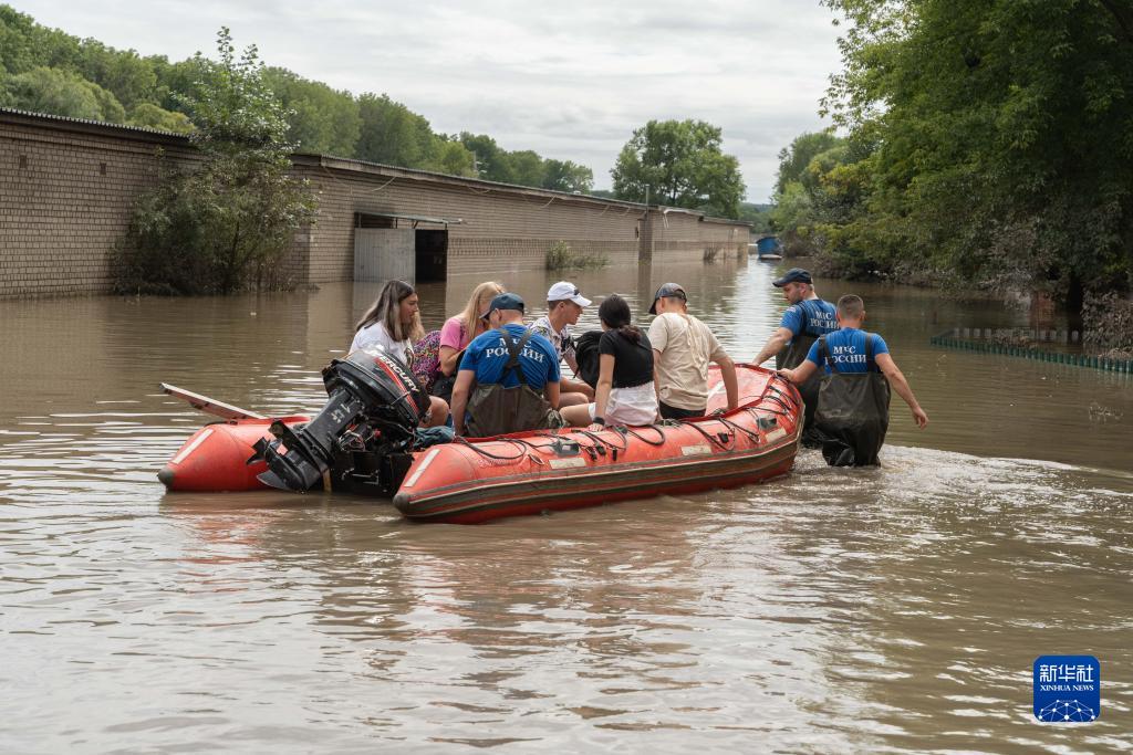 8月15日,在俄罗斯乌苏里斯克市,救援人员帮助受灾居民出行。