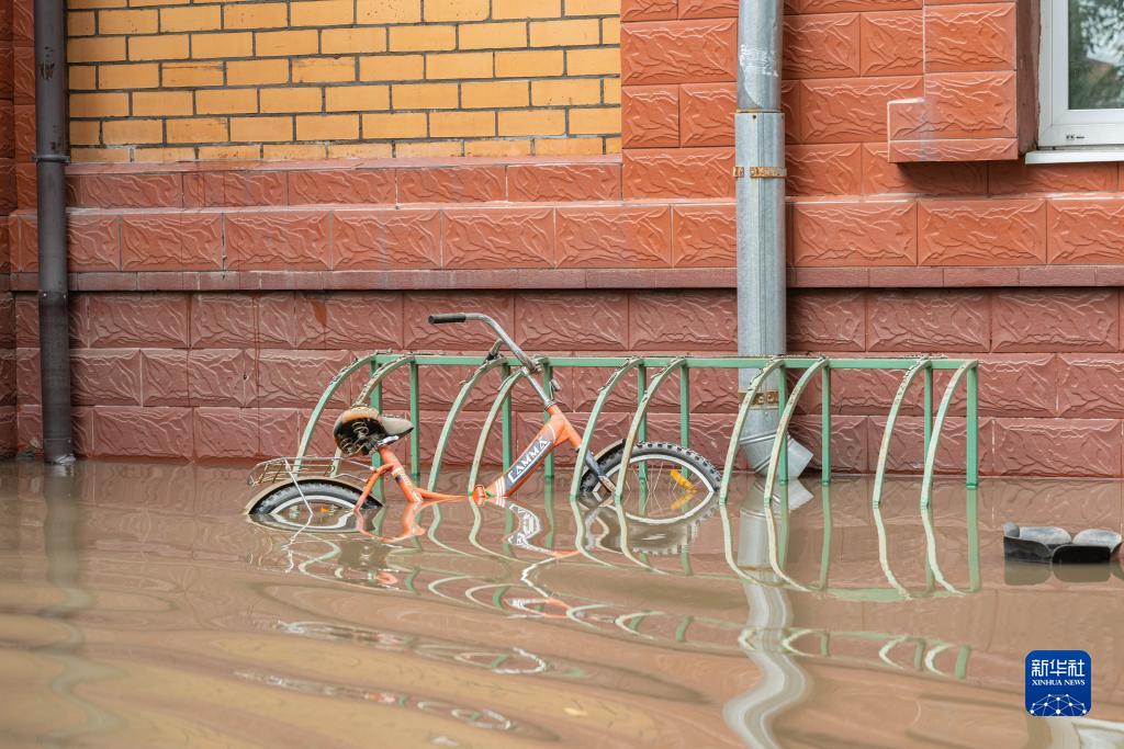 这是8月15日在俄罗斯乌苏里斯克市拍摄的泡在洪水中的自行车。