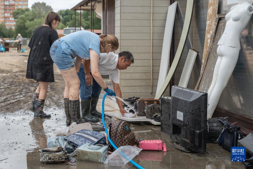 8月15日,在俄罗斯乌苏里斯克市,人们清洗被洪水浸泡过的物品。