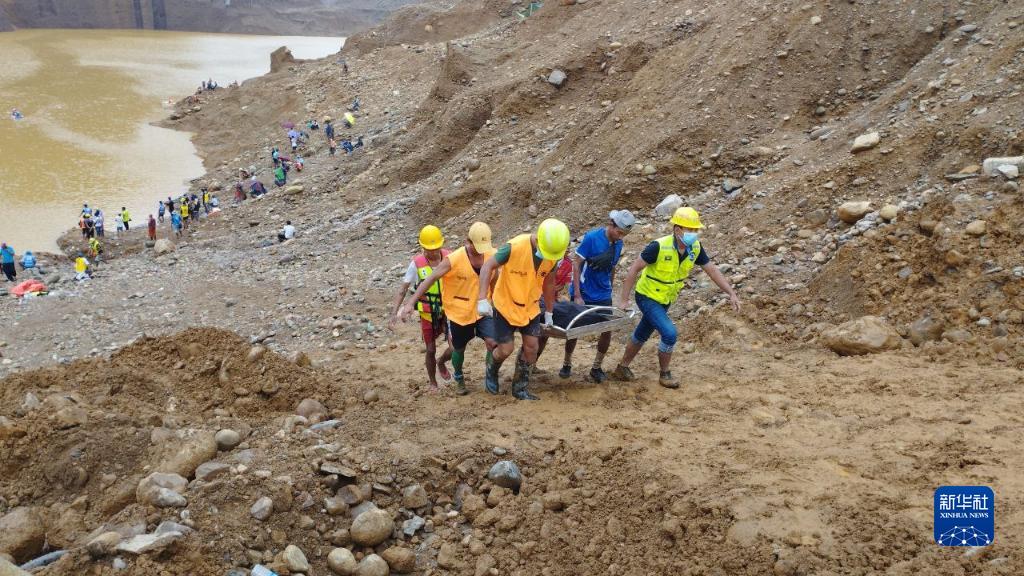 8月15日,在缅甸克钦邦帕甘镇,救援人员在玉石矿场坍塌事故现场搜救到一名遇难者。