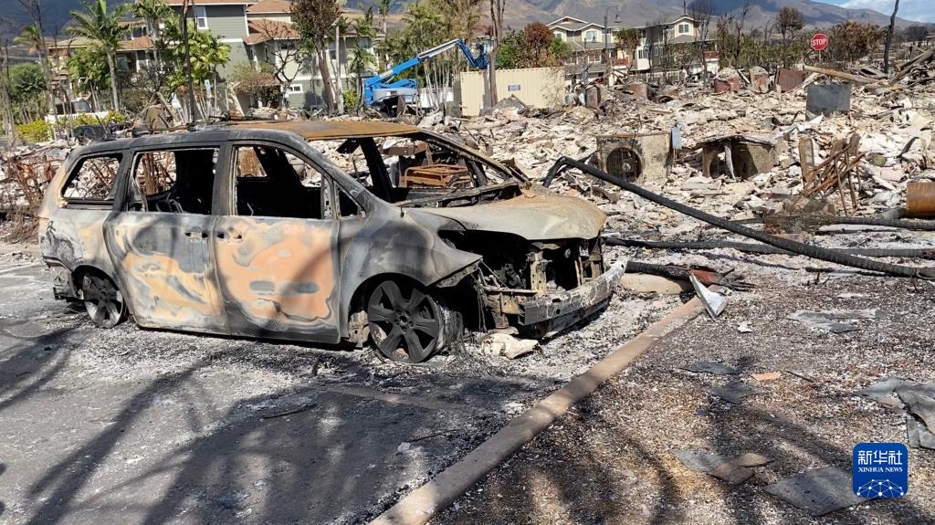 这是8月14日在美国夏威夷州毛伊岛拉海纳拍摄的野火烧毁的建筑和汽车残骸。