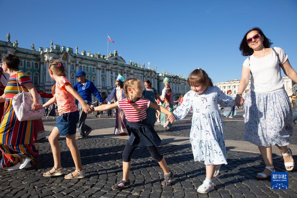 8月15日,民众在俄罗斯圣彼得堡冬宫广场跳圆圈舞。