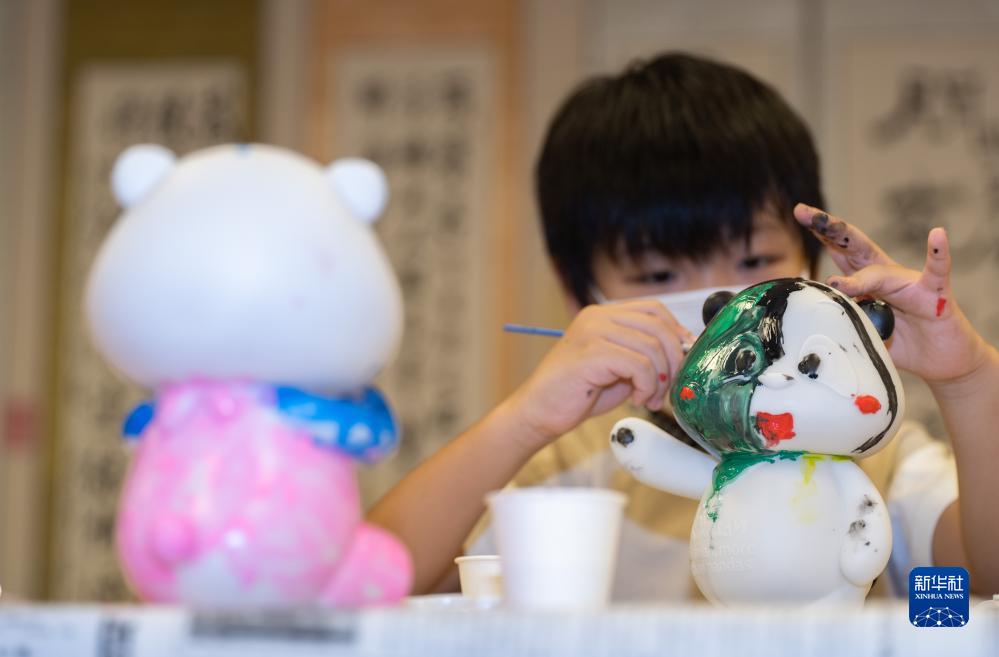 8月16日,在日本东京中国文化中心,一名儿童制作属于自己的彩色大熊猫玩偶。