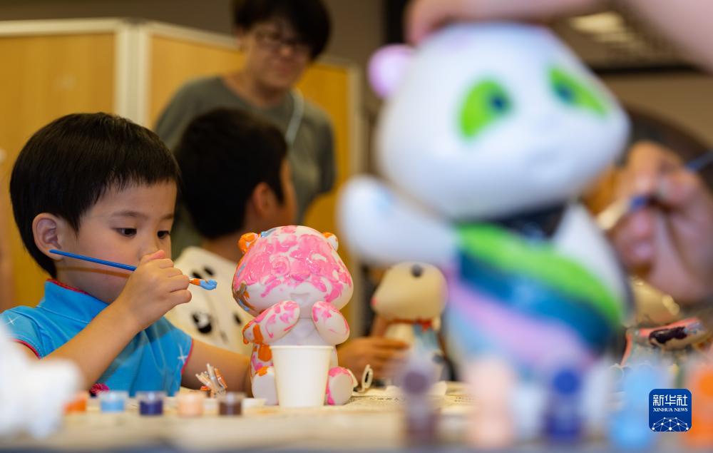 8月16日,在日本东京中国文化中心,人们制作属于自己的彩色大熊猫玩偶。