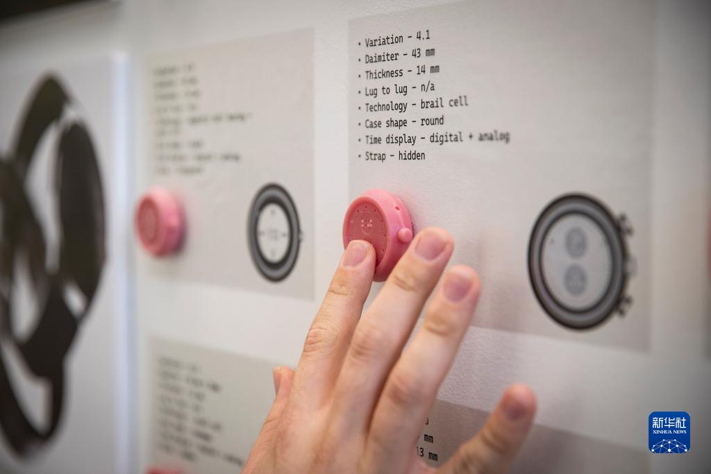 这是8月15日在以色列比撒列艺术设计学院毕业展上拍摄的为盲人设计的手表。