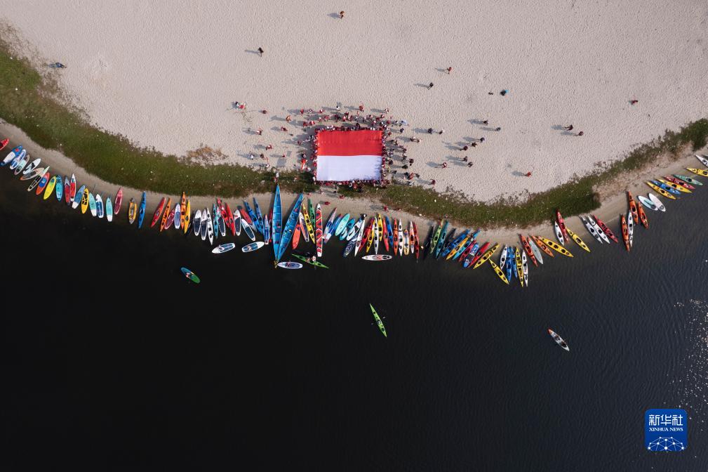 8月17日,在印度尼西亚雅加达安卒海湾,水上运动爱好者展开印尼国旗,庆祝独立日(无人机照片)。