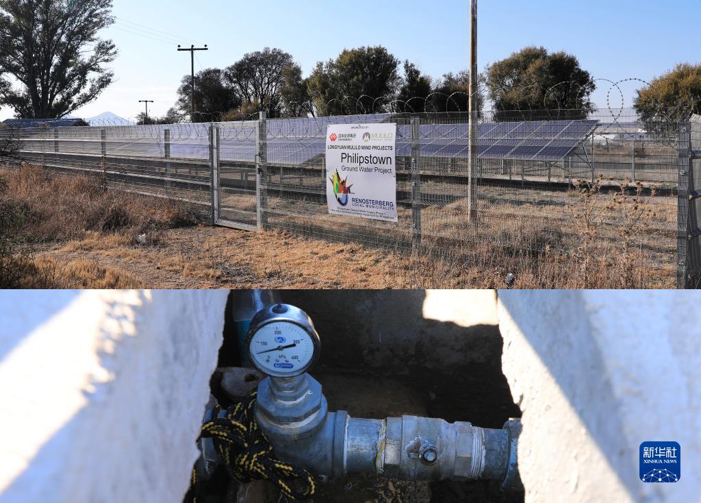 这是8月11日在南非北开普省德阿镇拍摄的由龙源南非公司修建的一个地下水引水项目(拼版照片)。
