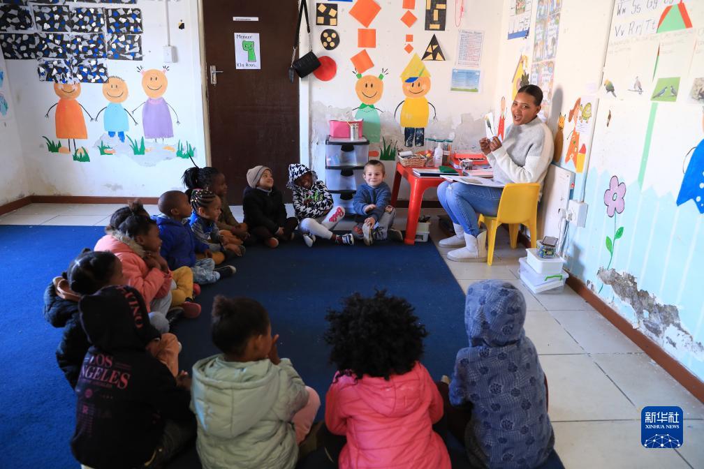 8月11日,在南非北开普省德阿镇一家龙源南非公司运营的儿童早教中心,老师在给孩子们上课。