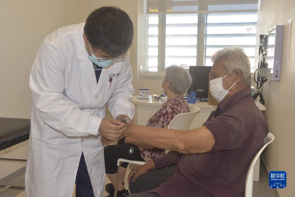 8月18日,在柬埔寨首都金边的考斯玛中柬友谊医院,援柬中医医疗队医生为患者诊疗。