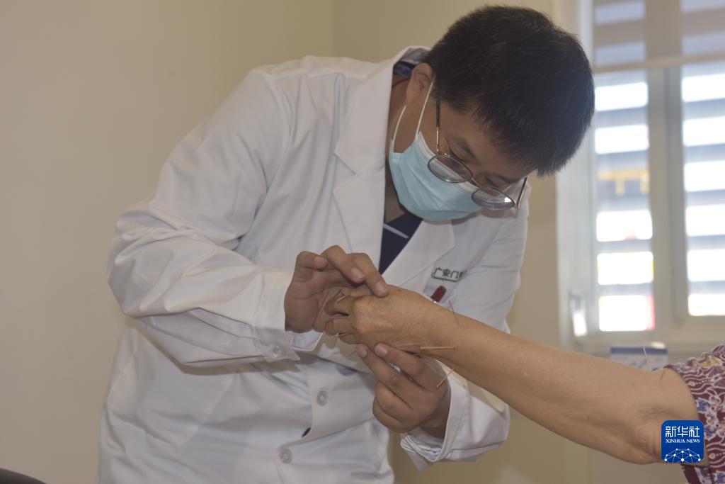 8月18日,在柬埔寨首都金边的考斯玛中柬友谊医院,援柬中医医疗队医生为患者诊疗。