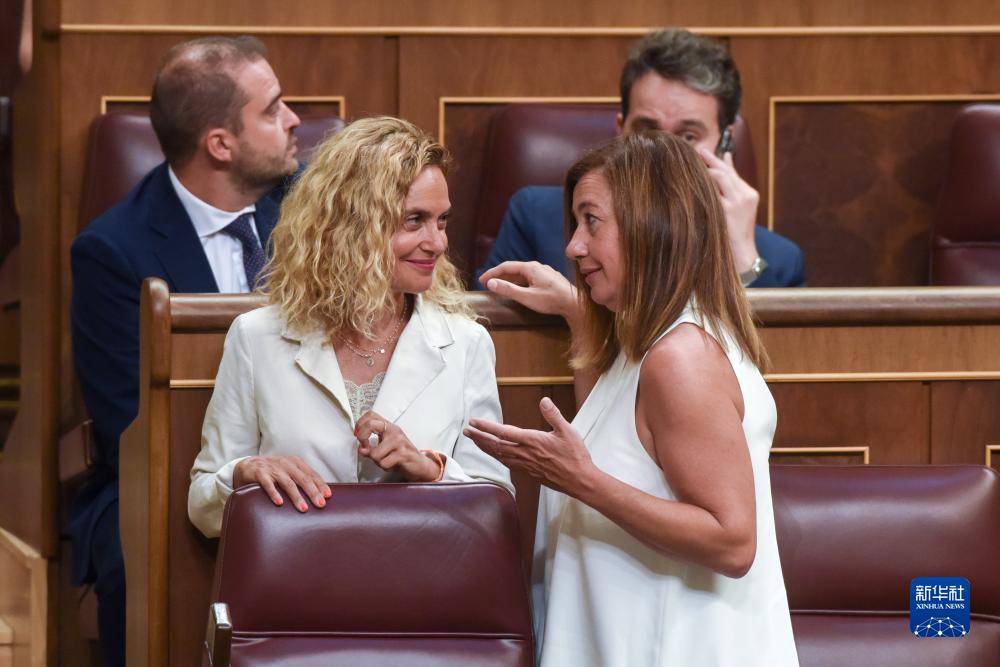 8月17日,在西班牙马德里,西班牙议会新任议长弗朗西娜·阿门戈尔(右)与前任议长梅丽特克塞尔·巴泰特在议会交谈。