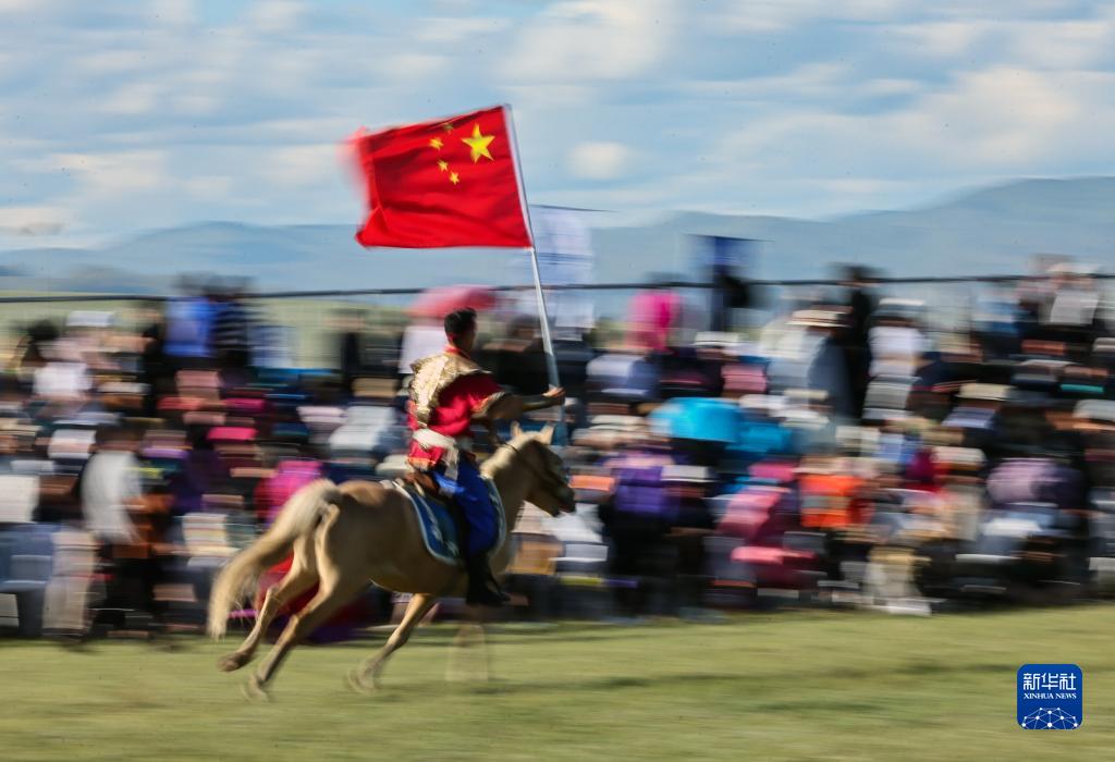 8月18日,在蒙古国泰吉山谷,文化节开幕式上一名蒙古国骑手展示中国国旗。