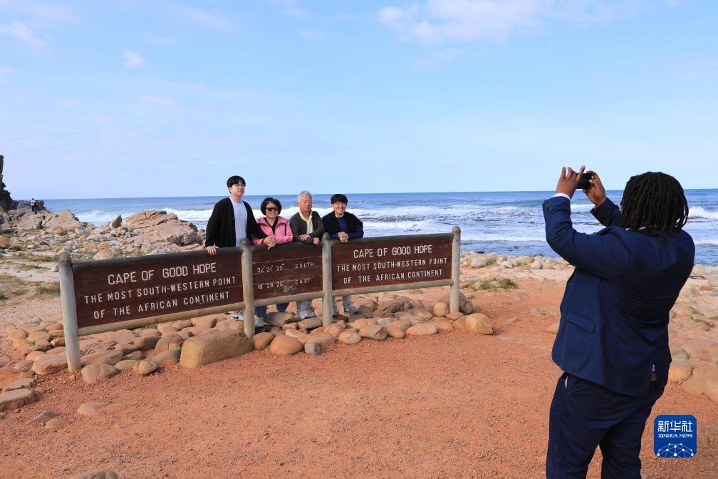 8月12日,游客在南非开普敦好望角合影。