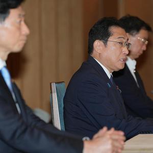 8月21日,在日本东京首相官邸,日本全国渔业协会联合会会长坂本雅信(右二)在与日本首相岸田文雄会见时发言。
