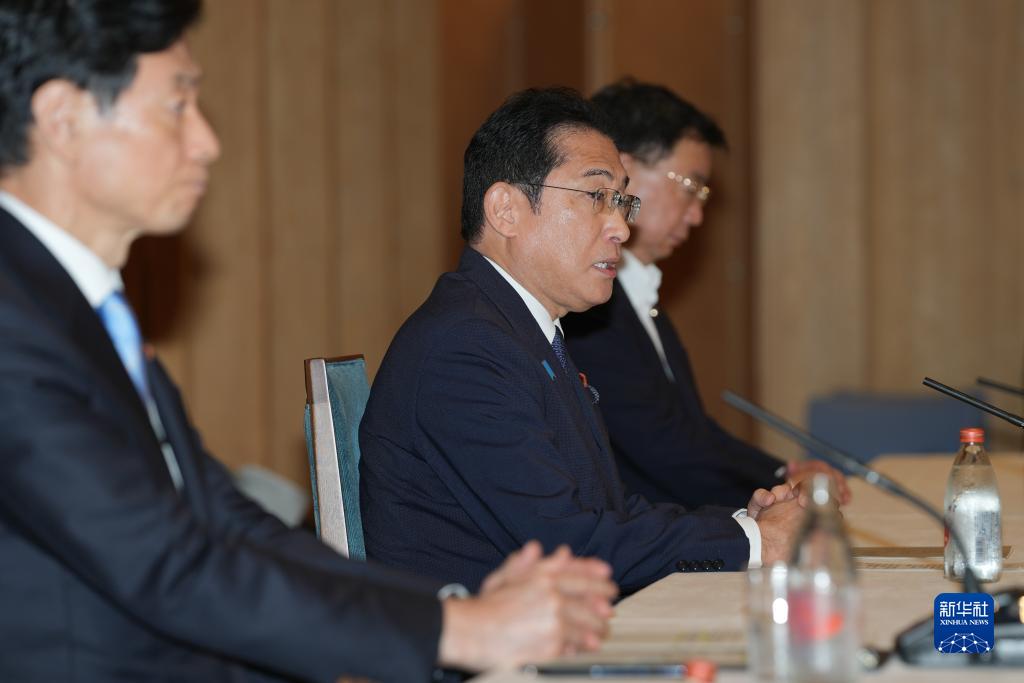 8月21日,在日本东京首相官邸,日本首相岸田文雄(中)在与日本全国渔业协会联合会会长坂本雅信一行会见时发言。