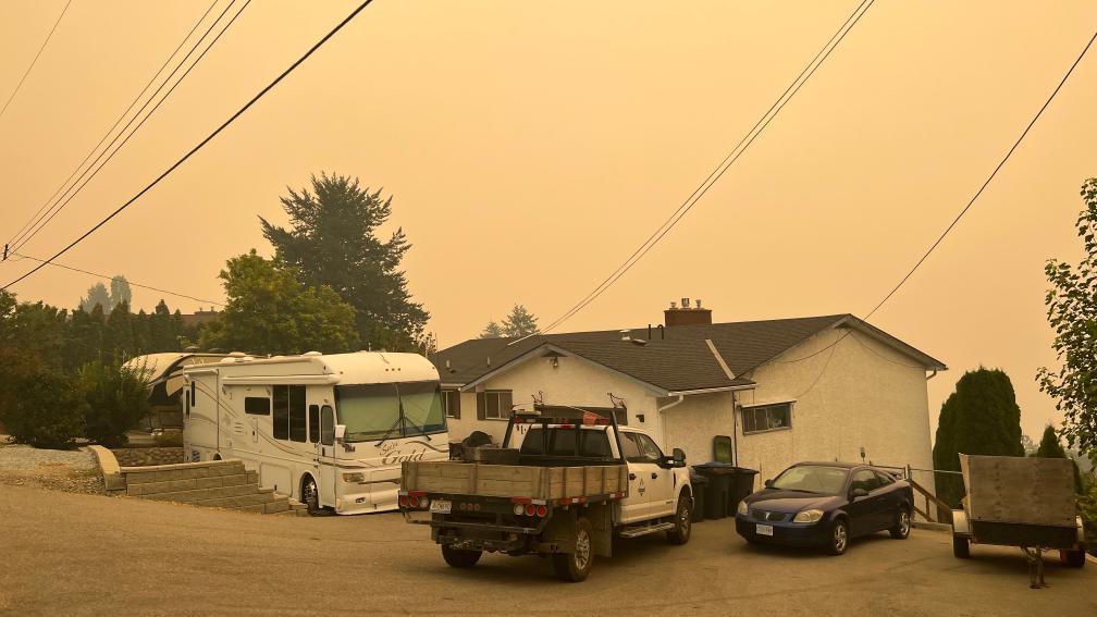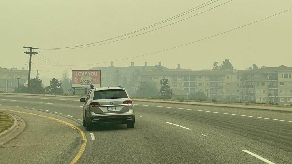 山火烟尘笼罩下的加拿大基洛纳市,天空灰暗,空气中弥漫着焦糊味道。