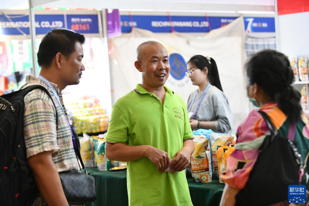 陈杰(中)在南博会现场和别的展商交流(8月18日摄)。新华社记者 陈欣波 摄