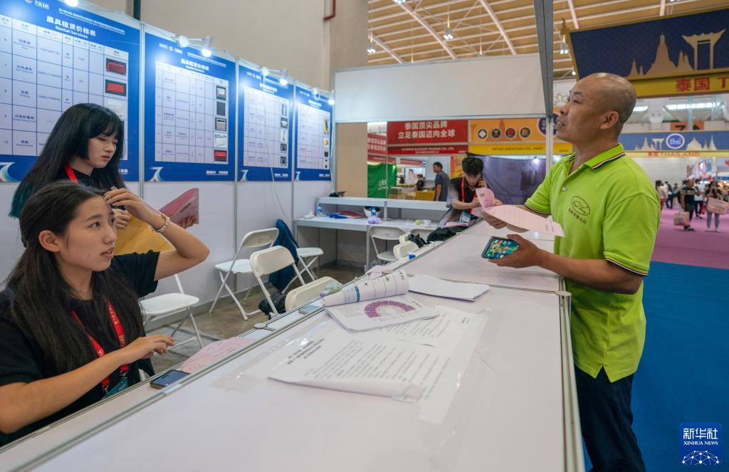陈杰在昆明滇池国际会展中心内的服务台领取提货单(8月18日摄)。新华社记者 陈欣波 摄